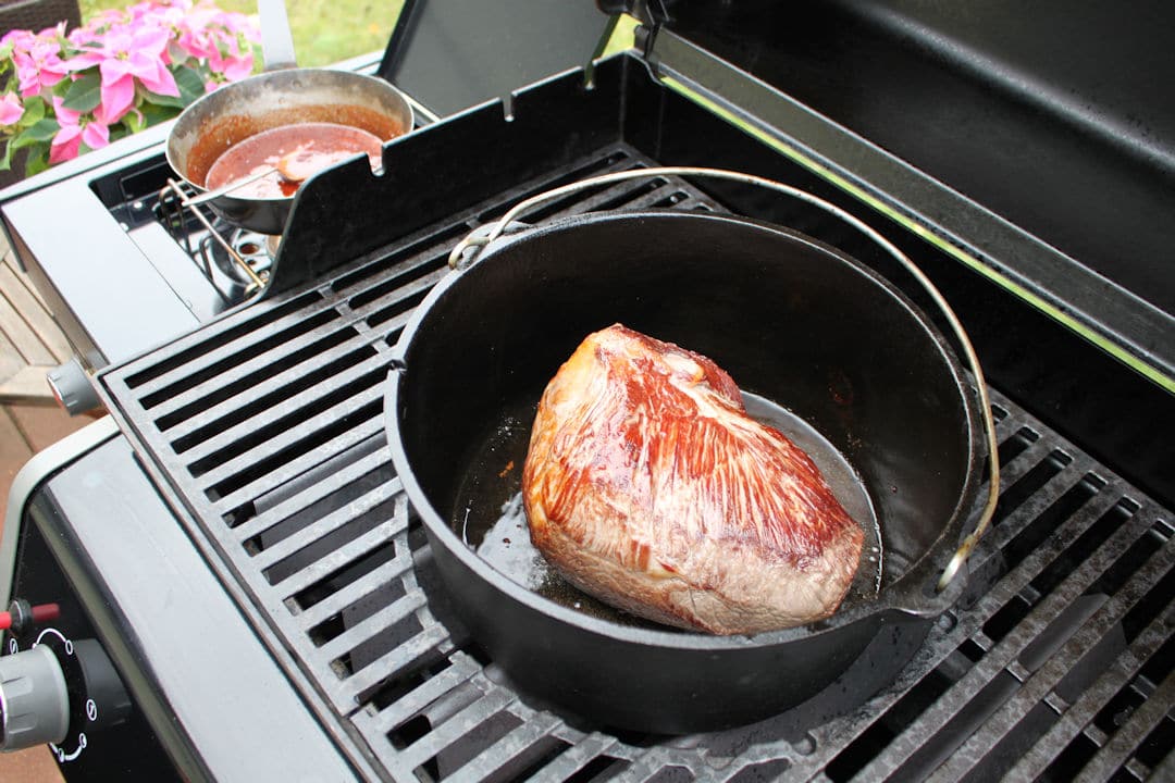 Zum einen kannst du den Dutch Oven auf den Rost deines Gasgrills stellen. Starte dazu alle Brenner und lass den Dutch Oven so richtig heiß werden. Dann ist er bereit, um das Rindfleisch von allen Seiten kurz anzubraten.