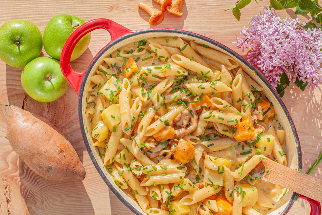 Ich habe meiner Version zwei Zutaten zugegeben, die nicht auf der Liste der traditionellen Älplermagronen stehen. Da sind die Süßkartoffeln, die dem Gericht eine unaufdringliche Süße verleihen, wenn man einen Würfel davon auf der Gabel hat. Ersetze sie durch zusätzliche Kartoffeln in gleicher Menge, wenn du beim traditionellen Rezept bleiben willst.