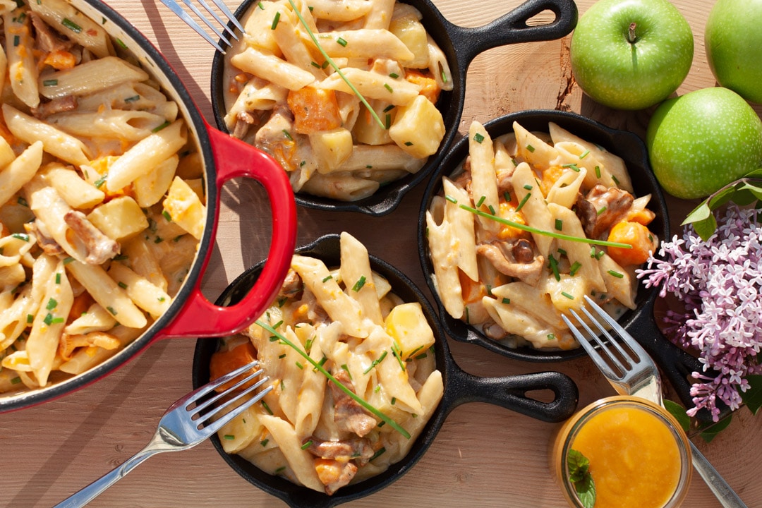Auf den ersten Blick mag es etwas ungewöhnlich klingen, für die Älplermagronen Kartoffeln und Pasta zu mischen, mit Sahnesauce und Käse zu verbinden und dazu Apfelmus zu servieren. Wenn man dieses traditionelle Sennengericht aus der Schweiz aber einmal probiert hat, dann fragt man sich, warum man diese Kombination nicht öfter anwendet.
