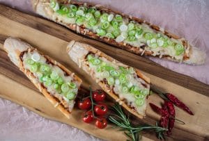 - Nach ca. 15 Minuten bei 220°C die Baguettes mit den in Ringe geschnittenen Frühlingszwiebeln bestreuen.