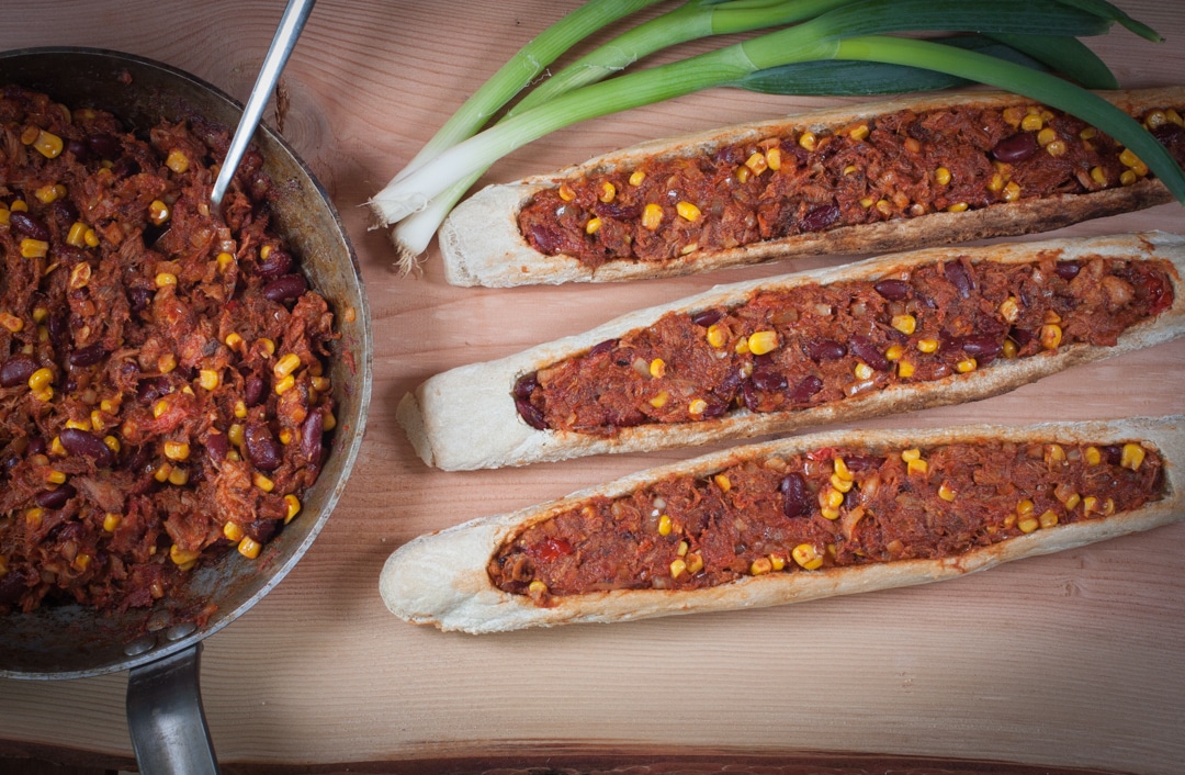 Die Füllung besteht in diesem Fall aus einer selbstgemachten BBQ-Sauce, Bohnen, Mais und Pulled Pork. Denkbar sind aber auch andere Zutaten wie Pulled Chicken, Hackfleisch, Champignons, Paprika.