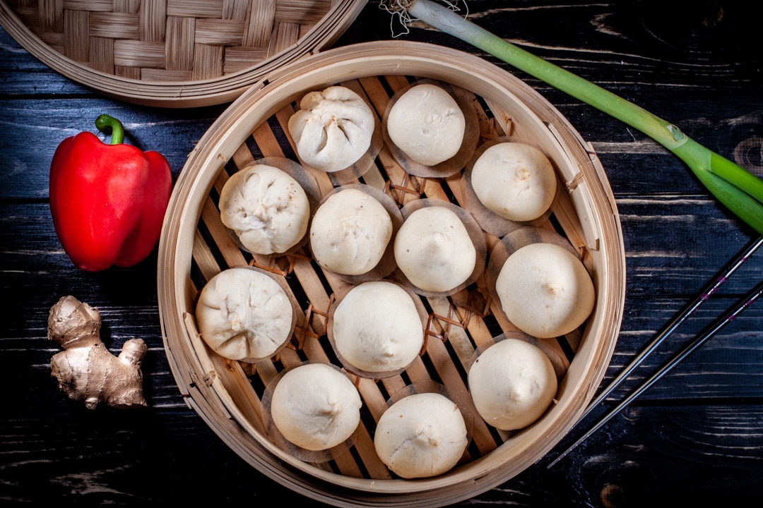 - In einem großen Kochtopf ca. 2 Liter Wasser zum kochen bringen. Den gefüllten Bambusdämpfer mit Deckel auf den Topf stellen und die Baozi für 20 Minuten dämpfen. Man kann mehrere Dampfgarkörbe übereinander stapeln. Auf diese Weise lassen sich die Teigtaschen in einem Schritt dämpfen.