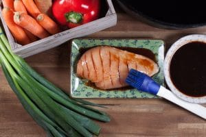 - Die Hähnchenbrustfilets an der Oberfläche einschneiden, damit die Marinade ein Stück in das Fleisch fließen kann. Die Marinade großzügig mit einem Pinsel auf dem Fleisch verteilen. Mindestens 30 Minuten einwirken lassen.