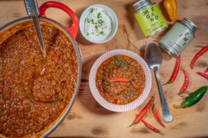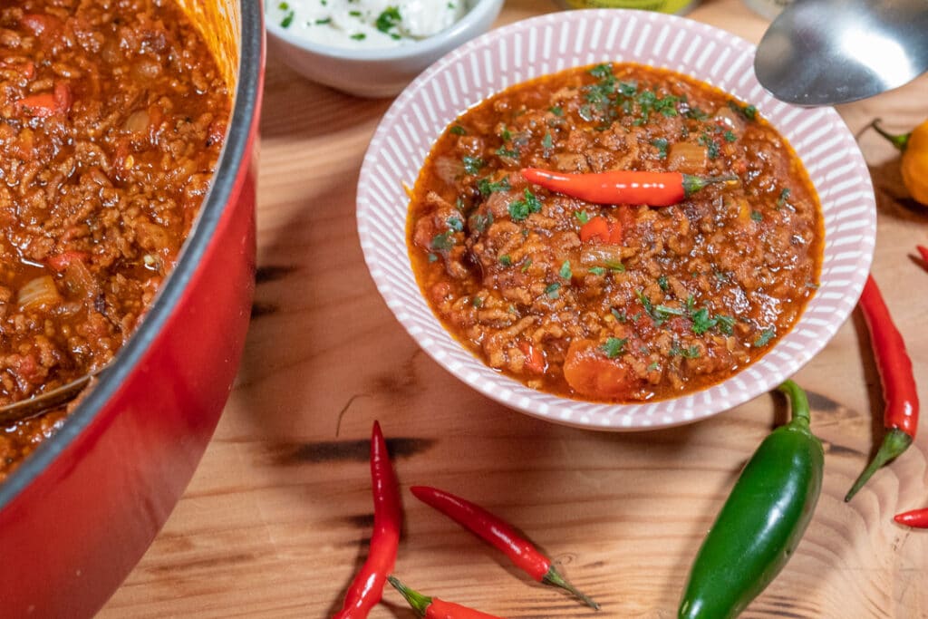 Wir reichen zu unserem Chili deshalb gerne eine Mischung aus Creme fraiche und Sour Cream. Wem das Chili zu scharf ist, sollte einen großen Kleks davon in die Portion rühren.