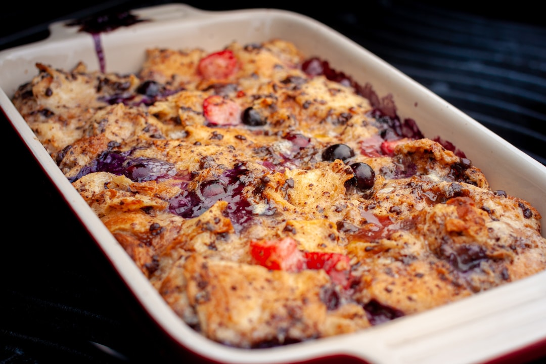Der Croissant-Auflauf ist ein Dessert, das eine Menge her macht, sich aber ganz leicht zubereiten lässt. Der Vorteil: es ist nicht nötig, einen Teig anzurühren. Stattdessen verwendet man altbackene Croissants, die in kleine Stücke gezupft werden. Ich habe sie einen Tag nach dem Einkauf verwendet. Sie werden durch eine Mischung aus Milch, Sahne und Ei verbunden, mit Beeren, Schokolade und einem Schuss Rum verfeinert. Durch den Aufenthalt im Backofen oder auf dem Grill werden aus den Croissants knusprige Bissen, die mit den Früchten und der Schokolade verschmelzen.