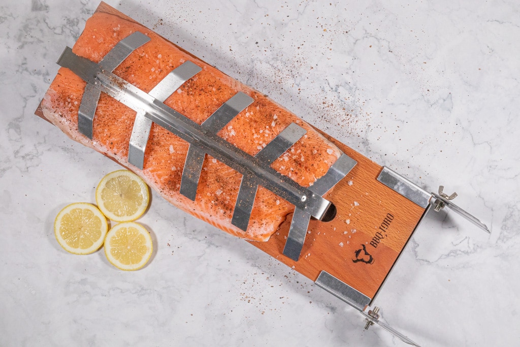 Tipp Nr. 2: Befestige den Lachs immer mit der Spitze des Schwanzes nach oben auf dem Brett, während die dicke Seite des Filets nach unten zeigt. Auf diese Weise bekommt die dünne Schwanzspitze weniger Hitze ab, als die unten befindliche dicke Seite. Die Hitze ist am unteren Ende des Brettes am größten und am oberen Ende am geringsten.