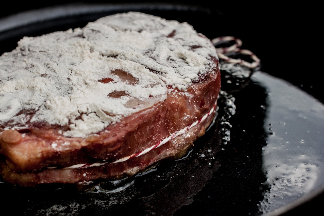 - Die Beinscheiben mit dem Mehl bestreuen. Ich habe sie mit Küchengarn gebunden, damit sie bei der Zubereitung in einem Stück bleiben. Das klappt aber nur, wenn man sie beim Schmoren nicht zu stark bewegt.