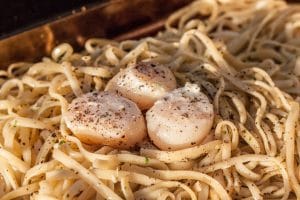 - Die Kammmuscheln zu der fertigen Pasta legen.