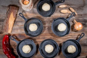 Wir haben kleine Pfännchen aus Gusseisen von BBQ-Toro * verwendet. So kannst du jedem Gast ein eigenes Pfannenbrot servieren. Unser Rezept funktioniert natürlich auch mit großen Pfannen *. Gegebenenfalls musst du die angegebene Backzeit dann leicht erhöhen.