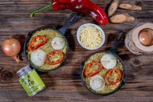Vegetarisch, italienisch und leicht wird es mit dem zweiten Belag: Das Pfannenbrot wird mit Paprika, Zwiebeln, Pesto und Käse zubereitet. Getrockneter Oregano sorgt für ein mediterranes Geschmackserlebnis.