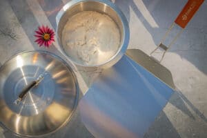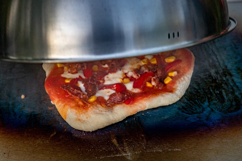 Dabei sind auch Wärmeglocken *, die für einen Hamburger deutlich zu groß sind. Mit Ihnen kann man Gemüse dämpfen, Essen warmhalten, aber natürlich auch Käse zum Schmelzen bringen. Und so kamen wir auf die Idee, mit Wärmeglocken, die einen Durchmesser von 30 cm haben, eine Pizza zu backen. Von unten sorgt die Hitze der Plancha für einen knusprigen Boden, von oben kommt die Hitze über die Wärmeglocke * an den Belag und bringt den Käse zum Schmelzen.