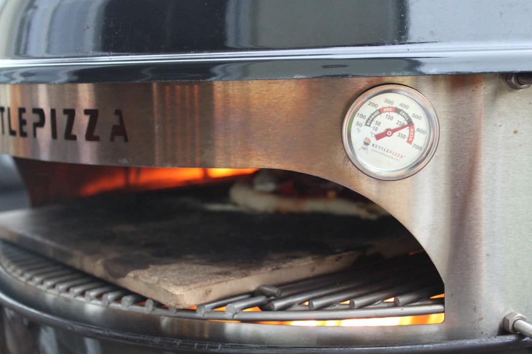 - Den Pizzastein auf den Rost des Grills auflegen. Dabei darauf achten, dass der Stein nicht den Teil des „Ofens“ abdeckt, in dem das Buchenholz brennt. Sonst würde dieser überhitzen und der Boden der Pizza schwarz werden. Den Deckel des Grills aufsetzen und dem Ofen 20 Minuten Zeit geben, um aufzuheizen.