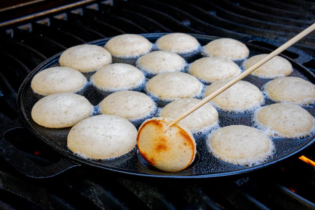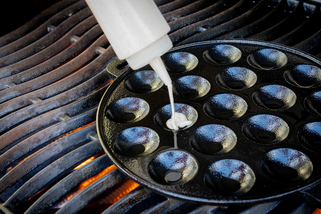 Vorbereiten der Poffertjes-Form auf dem Gasgrill