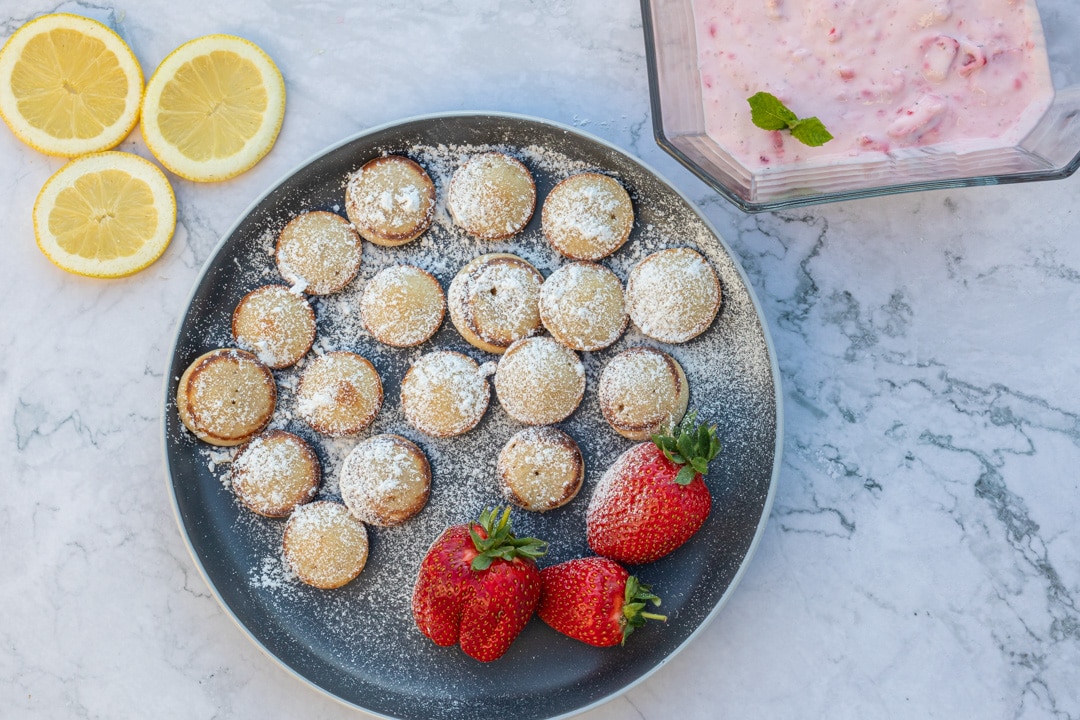 Bei der Auswahl an Zugaben, die zu den Poffertjes passen, kannst du dich an dem orientieren, dass auch zu den großen Pfannkuchen passt. Traditionell werden sie mit viel Puderzucker bestreut und zusammen mit Butter, Zuckerrübensirup oder Ahornsirup serviert. Wir haben Joghurt mit Erdbeermark und Erdbeerstücken gemischt und dazu serviert. Das Rezept findest du auf dieser Seite.