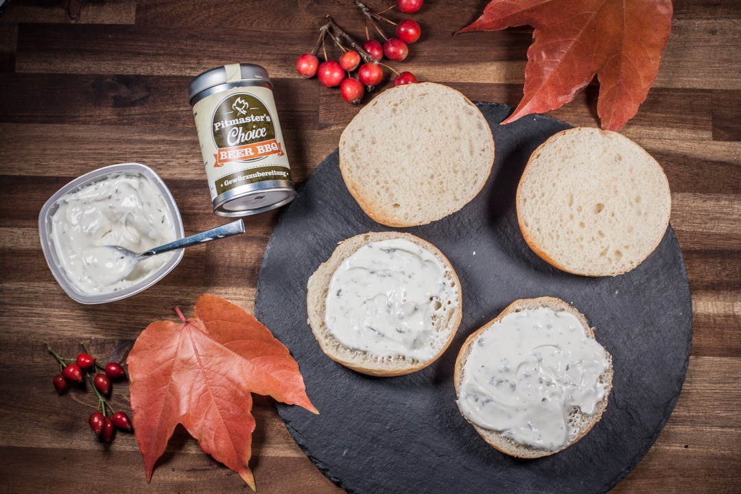 - Für eine zweite Variante den Deckel der Buns mit einer cremigen BBQ-Sauce bestreichen.
