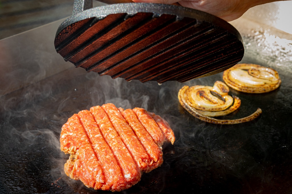 Durch das Pressen entsteht ein intensiver Kontakt zwischen heißem Metall und dem Fleisch. Auf diese Weise ergeben sich besonders viele Röstaromen auf der Oberfläche des Pattys. Röstaromen sind es, die einen Hamburger so lecker machen.