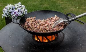 In der Außenküche hat man dafür mehrere gute Möglichkeiten. Zum einen kann man den Wok direkt auf den Grill stellen. Dabei ist es egal, ob ein Gas- oder Holzkohlegrill zum Einsatz kommt. Besonders geeignet ist das GBS-System (Gourmet BBQ System) der Fa. Weber, bei der die Entnahme eines kreisrunden Teils aus der Mitte des Rostes möglich ist. So entsteht Platz, um einen Wok dort einzusetzen. Auf diese Weise wird das Kochgeschirr noch näher an die Brenner oder die Kohle geführt. Schließt man für den Aufheizvorgang den Deckel des Grills und arbeitet mit starker direkter Hitze, ist das für den Wok-Einsatz schon genug. Ebenfalls perfekte Ergebnisse kann man mit Wok-Einsätzen erzielen, wie sie z.B. die Fa. moesta-bbq für den Holzkohlegrill anbietet. Kostspieliger aber noch kraftvoller sind Wok-Brenner wie der „Roaring Dragon“, die mit Gas befeuert werden. Wer eine Feuerplatte mit einer Tonne sein eigen nennt, bekommt die Möglichkeit für das Kochen mit dem Wok fast automatisch mit dazu. Für das Loch in der Feuerplatte gibt es Einsätze, die das Platzieren eines Woks erlauben.
