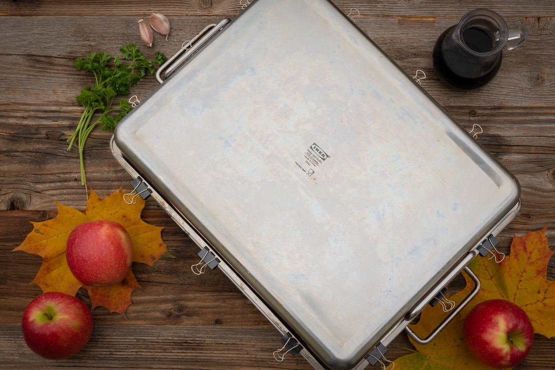 Die Lösung ist ein großer Bräter. Er muss nicht besonders hoch sein, denn eine Wildschweinkeule ist eher lang als hoch. Der Bräter sollte einen passenden Deckel besitzen, damit die Wildschweinkeule darin schmoren kann. Möglich ist aber auch der Einsatz von zwei Brätern, die du übereinander stellst und mit Klammern verbindest. Wir verwenden das Modell KONCIS von IKEA, dass eine preisgünstige Möglichkeit ist, eine Wildschweinkeule im Stück zuzubereiten.