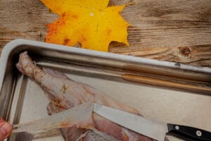 - Nun lässt sich die Silberhaut und überschüssiges Fett leicht mit einem scharfen Messer entfernen. Entleere den Bräter, verwirf die Marinade und reinige den Bräter.