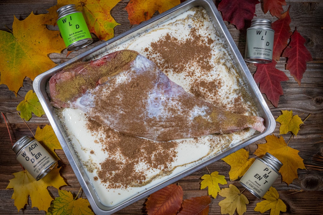 Ich habe mich für eine klassische Auswahl an Gewürzen entschieden. Wunderbar passen Piment, Lorbeerblätter, Muskatnüsse, Nelken und Wacholderbeeren zu dem kräftig dunklen Fleisch. Wenn du nur gelegentlich Wild zubereitest, kann sich die Anschaffung einer fertigen Gewürzmischung lohnen.