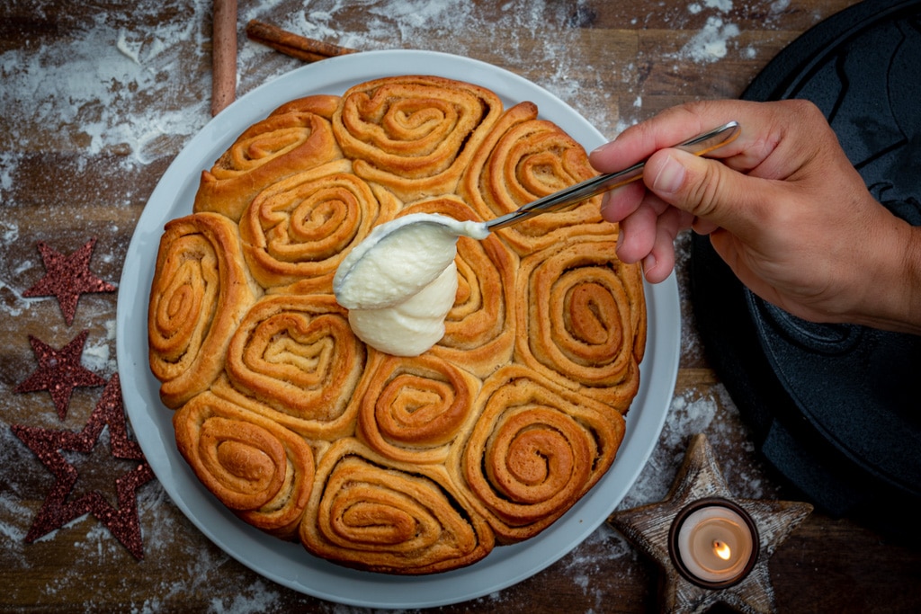 Was „On Top“ auf die Zimtschnecken kommt, ist meist eine Schicht aus Zuckerguss. Wir haben dieser bewähre Glasur aus Puderzucker und Wasser mit Butter und Frischkäse ergänzt. Auf diese Weise erhältst du ein cremiges Frosting, das perfekt zu den luftigen Zimtschnecken passt.